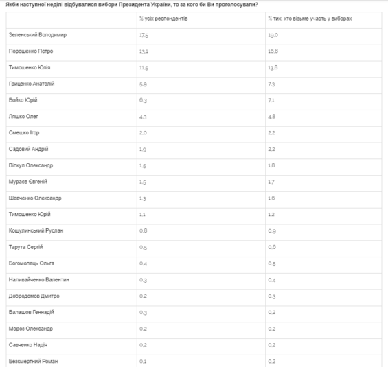 За Зеленского готовы проголосовать 19% респондентов, которые намерены участвовать в выборах. За Порошенко свои голоса готовы отдать 16,8%, а за Тимошенко 13,8%. Об этом свидетельствуют результаты опроса социологической службы Центра Разумкова.