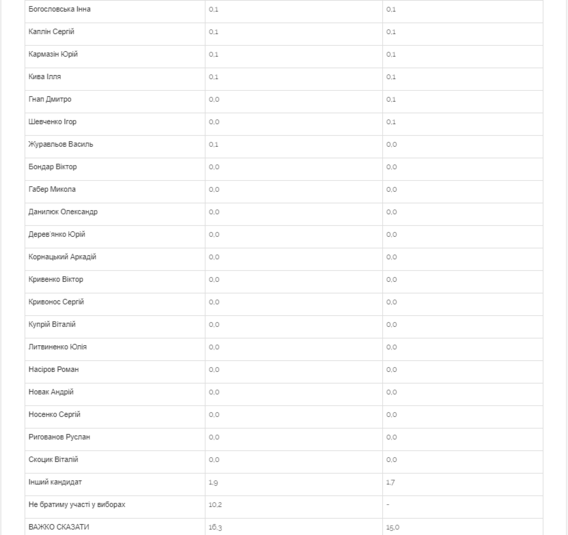 Четвертым в рейтинге оказался Анатолий Гриценко, за него намерены проголосовать 7,3% тех, кто пойдет на выборы, за Юрия Бойко — 7,1%, за Олега Ляшко — 4,8%.