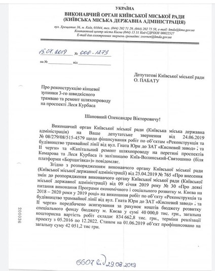 «Реконструкция и строительство трамвайной линии от улицы Гната Юры до ЗАО «Кислородный завод» I и II очереди продлится до декабря 2022 года. Что касается выполнения работ на объектах «Капитальный ремонт путепровода на пересечении проспектов Комарова и Леся Курбаса с железной дорогой Киев-Волынский-Святошино (около платформы «Борщаговка»), то и здесь срок реализации проекта продлится до ноября 2020 года. И все это вместе будет реконструкцией уже проведенного ремонта», - пересказал Пабат текст ответа Давтяна.