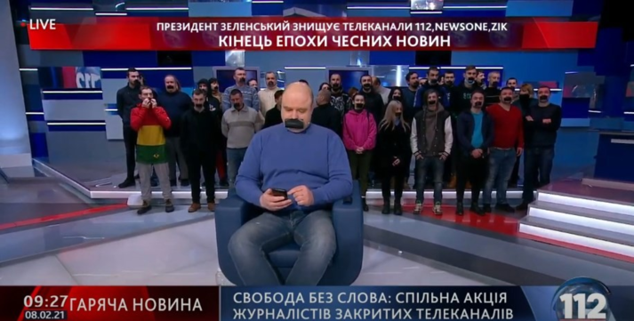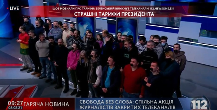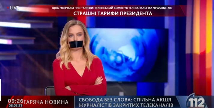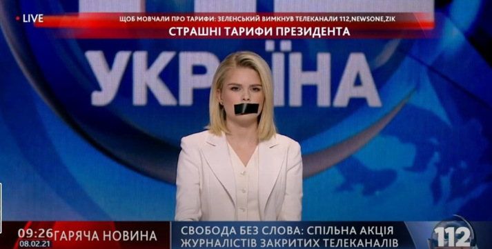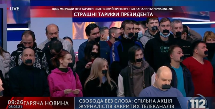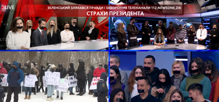 В студиях телеканалов «112 Украина», NewsOne и Zik съемочные группы появились в эфире с залепленными ртами. По словам журналистов, это символизирует ограничения свободы слова в Украине.