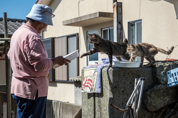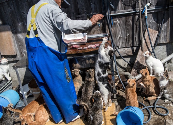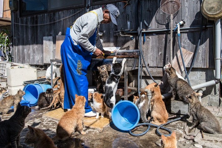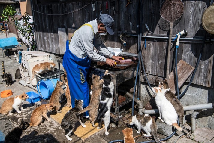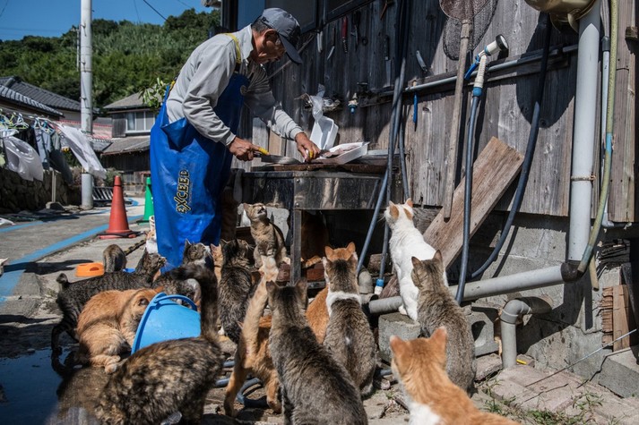 В данный момент их около 200 особей, а постоянно проживает на острове всего 9 человек. Как и во многих сельских районах Японии, большинство жителей покинули общину в поисках лучшей работы в городах, и люди, которые остались и кормят кошек, все пенсионеры.