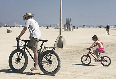 Передвигаться можно на своих двух, что является проблематично из-за огромных масштабов территории и жаркой погоде днем. Главным транспортным средством на Burning Man является велосипед.