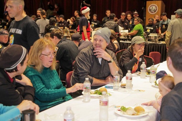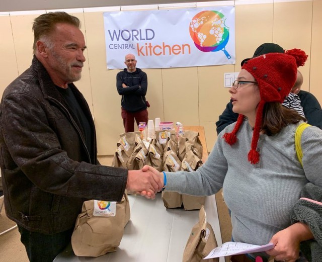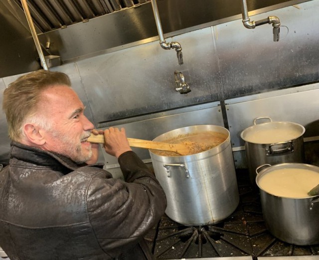 Даже Арнольд Шварценеггер принял активное участие в этой благотворительной акции. После готовки Шварценеггер раздавал еду и помогал волонтерам с уборкой