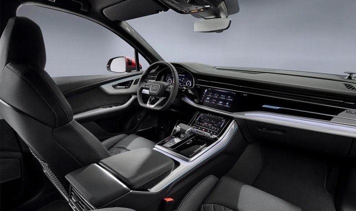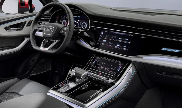 Внутри Q7 появилась новая передняя панель i-cocpit с двумя большими сенсорными дисплеями на центральной консоли в стиле новых A7. Верхний тачскрин отвечает за работу мультимедийной системы, а при помощи нижнего можно управлять климатической установкой. Кроме того, на Q7 теперь доступна цифровая приборная панель, новый голосовой ассистент, а также сервисы Amazon Alexa.