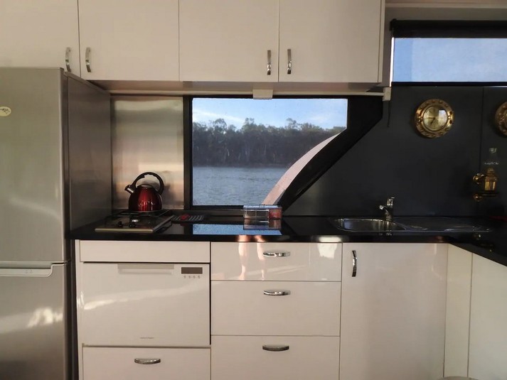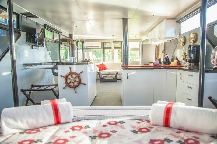 Планировка открытого плана, и хотя лодка остается неподвижной, когда в ней есть гости, Джим и Рут сказали, что они плавают на ней вдоль реки для проверки состояния и поездок в город.