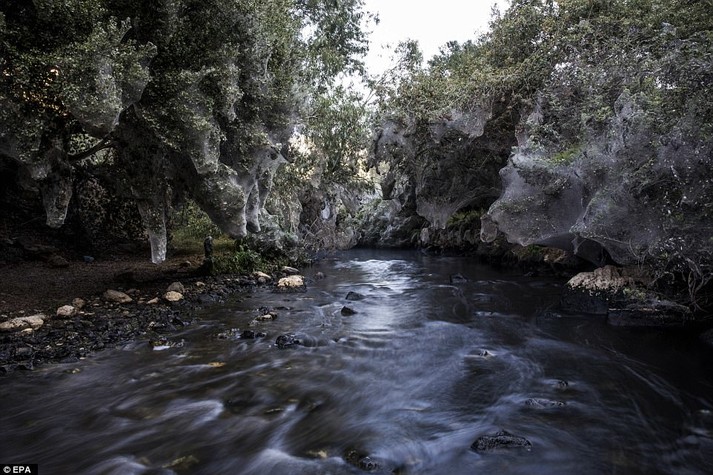 Вдоль дренажных бассейнов реки Сорек в Израиле миллионы пауков создали таинственный лес - деревья и кусты здесь завернуты в толстый слой паутины.