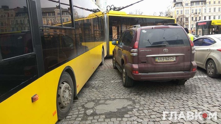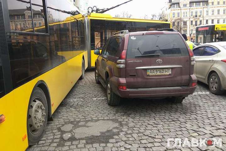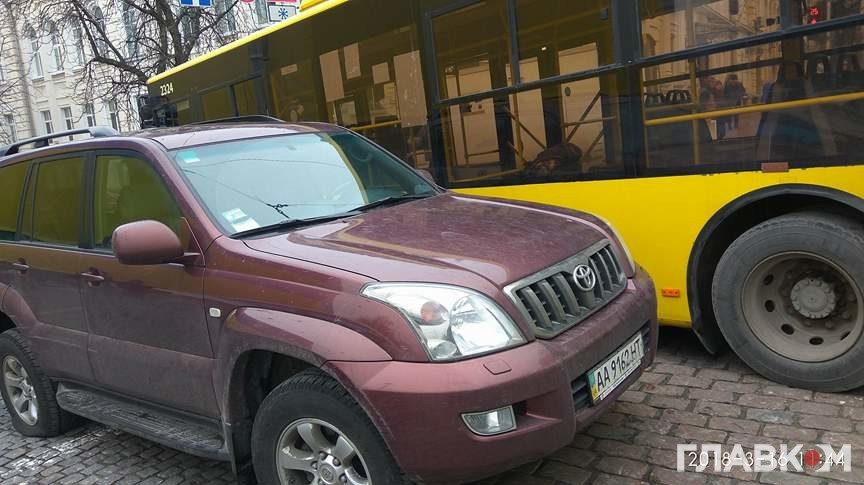 Инцидент произошел на Софийской площади. Водитель внедорожника Toyota Land Cruiser бордового цвета с номерным знаком АА 9162 НТ припарковал авто в неположенном месте на проезжей части, в результате чего заблокировал движение троллейбусов.
