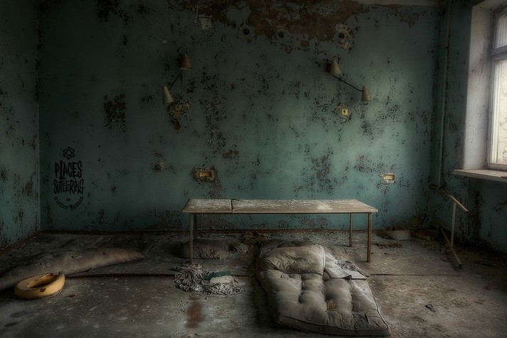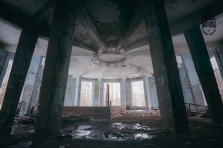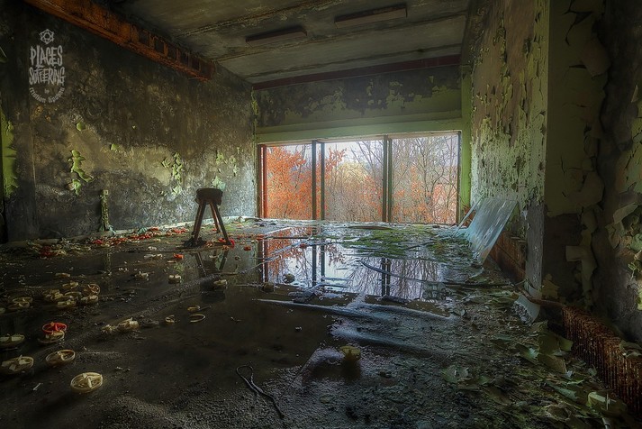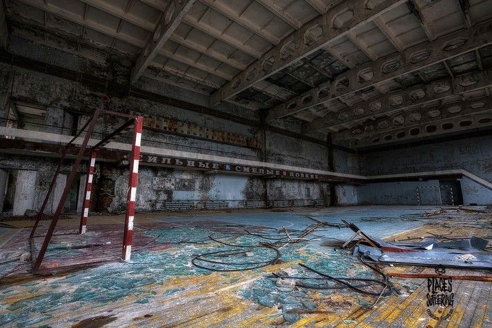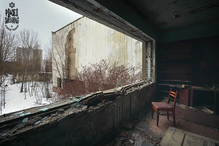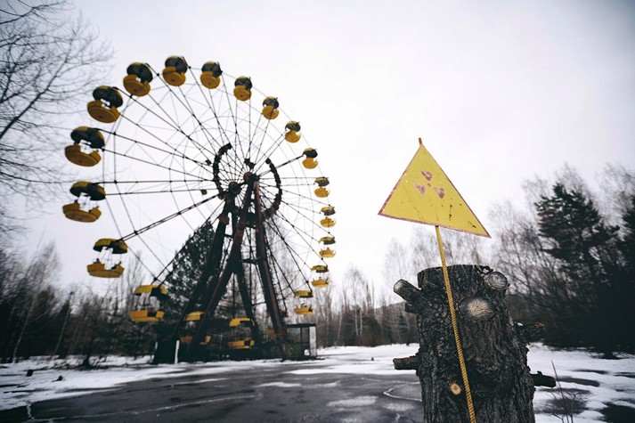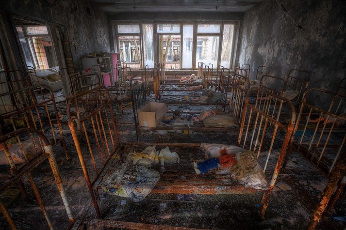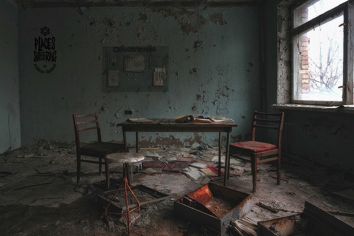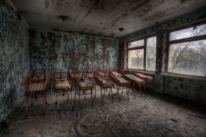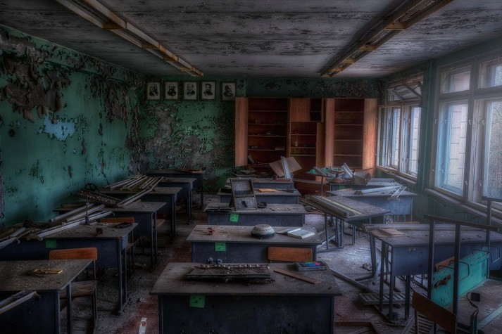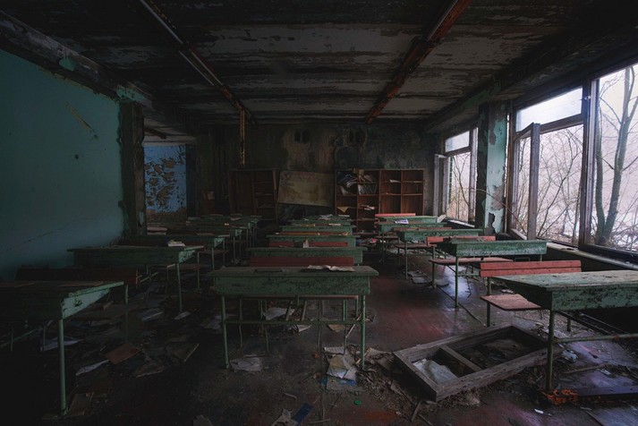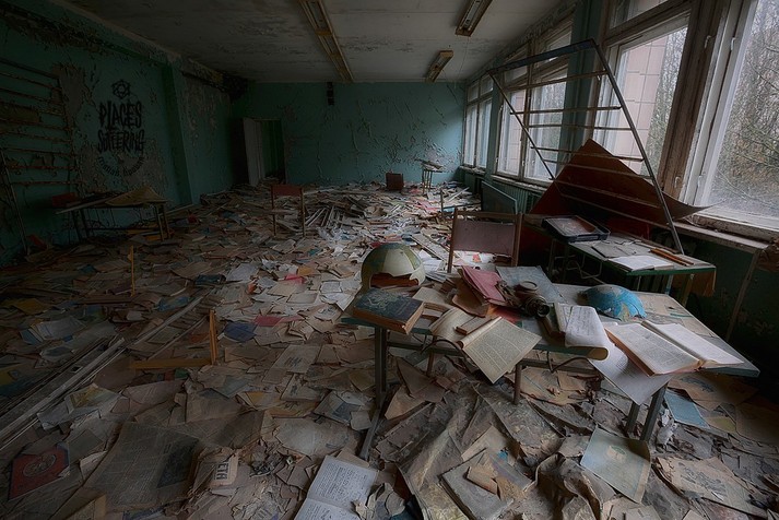 Колесо обозрения, детские кроватки, классы, наполненные пыльными партами, пианино на рушащейся сцене и другие предметы, оставшиеся спустя 32 года после ядерной катастрофы.