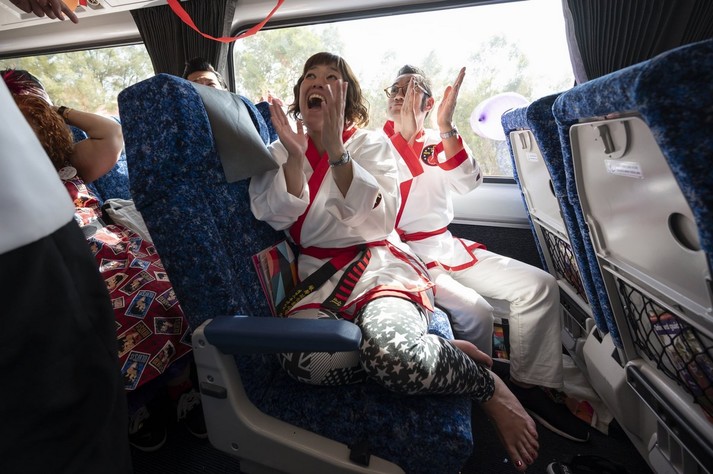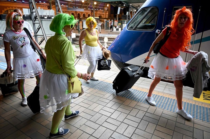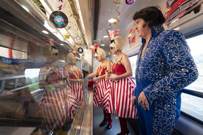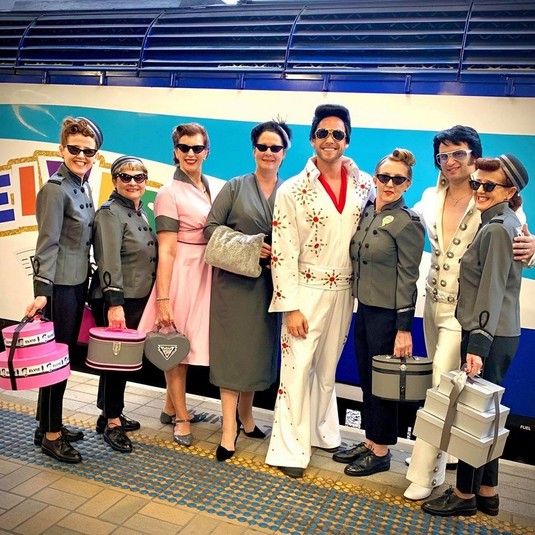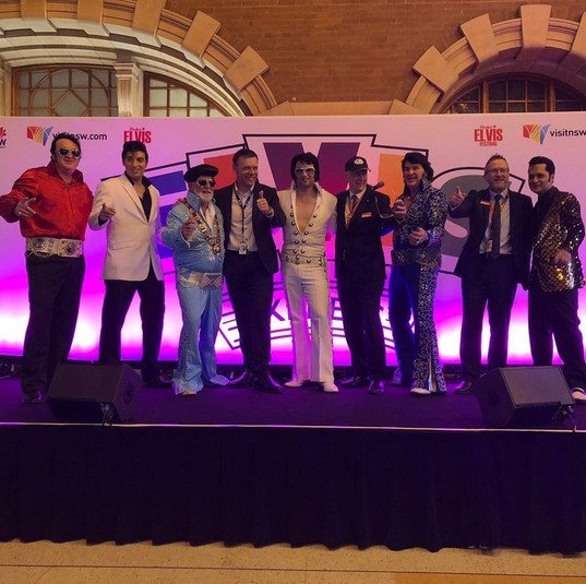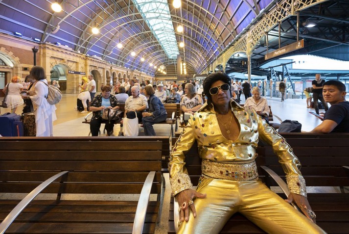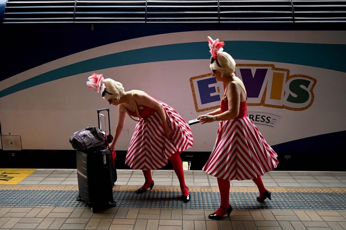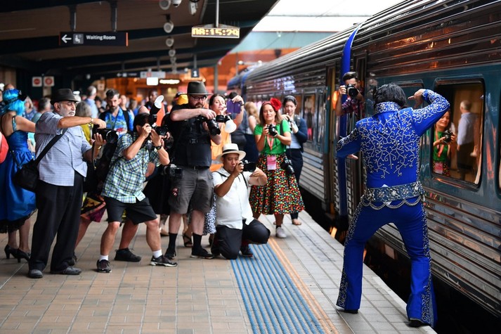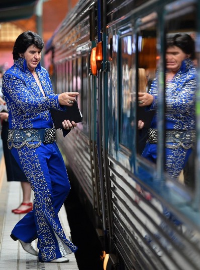 Десятки подражателей Элвиса собрались на Центральном вокзале Сиднея утром 9 января, чтобы сесть в Elvis Express. За семичасовую поездку поезд доставит их в Паркес, где ежегодно проводится фестиваль, посвященный королю рок-н-ролла.