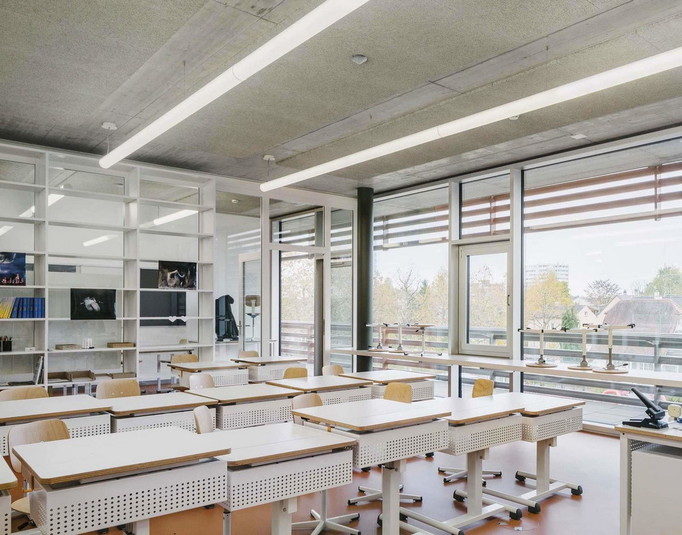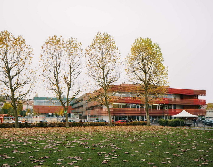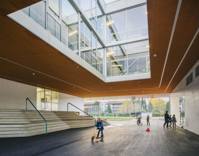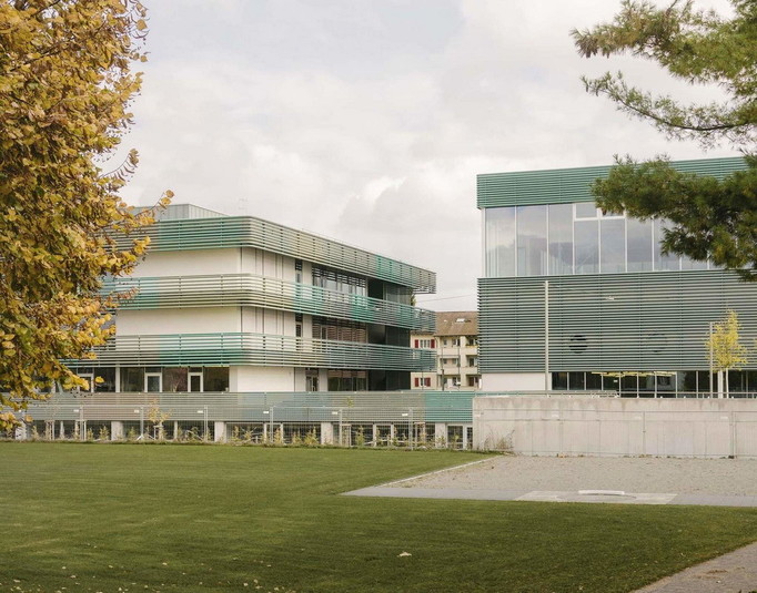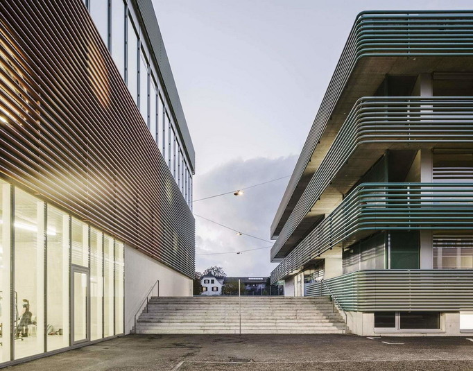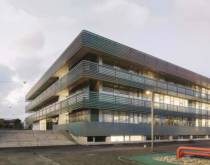 В ответ на значительный рост населения власти небольшого городка Альшвиль, Швейцария, который почти сливается с Базелем, объявили конкурс на строительство школы, рассчитанной на 600 детей. Выигравшая соревнование студия BUR Architekten осуществила проект, представляющий собой два здания, соединённых большим крытым переходом.