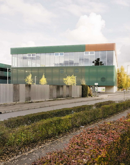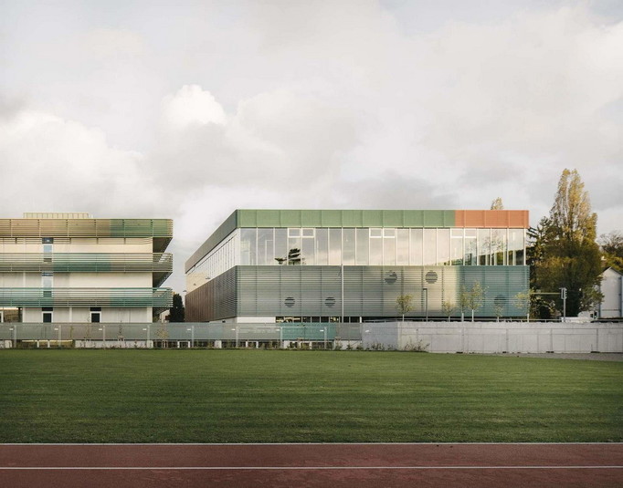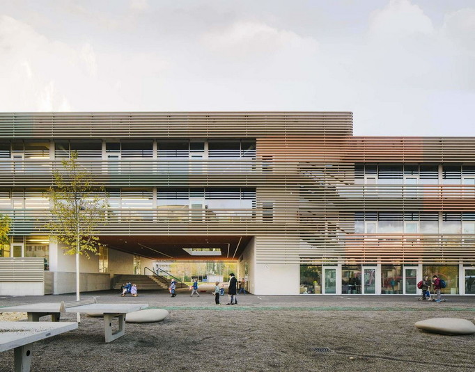 Непрерывность этого горизонтального покрытия, имеющего особые цвета в разных областях, подчёркивает дифференцирование этажей и функциональных зон школы. Каждый трубчатый элемент — шириной шесть метров и выполненный в одном из десяти оттенков — выступает отдельным пикселем. Цветовая игра фасадов поощряет активное восприятие архитектуры, делая здание большого размера цельным и выразительным.