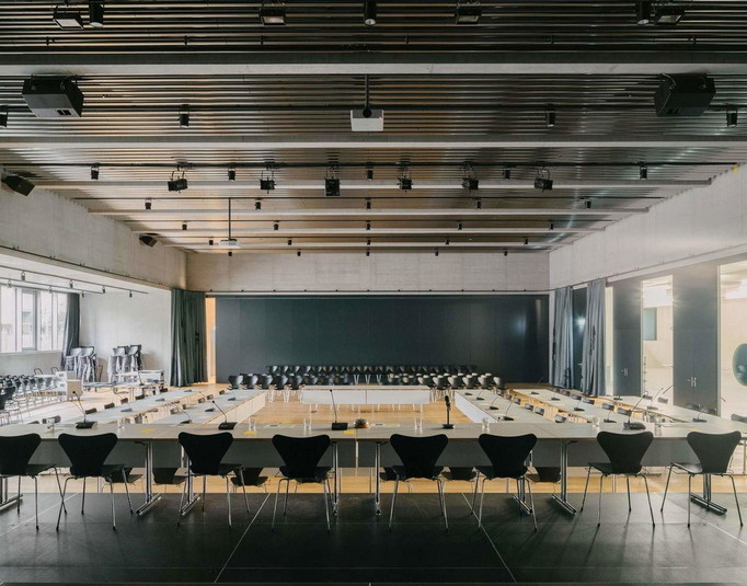 Решение о размещении спортивного зала на втором этаже освободило первый уровень для большой аудитории, которая приобрела очень публичный характер. Вскоре после введения здания в строй это пространство перестало быть просто частью школы, став популярным местом проведения политических встреч, концертов и театральных представлений.