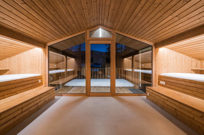 Внутри главной комнаты по бокам две большие кровати, а сзади, справа и слева от камина и кухни – две меньшие.