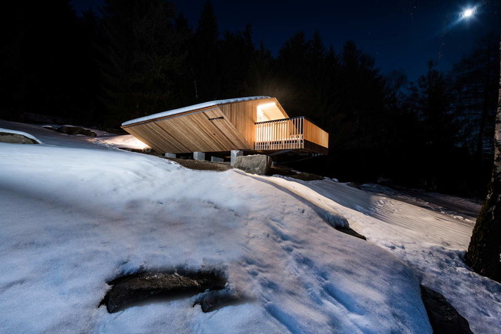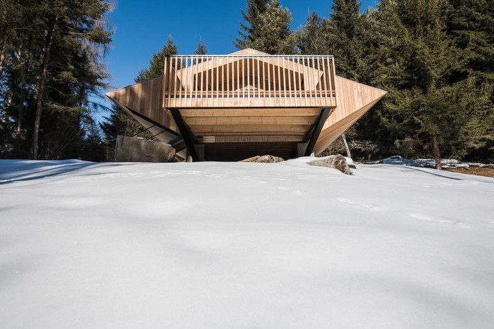 Деревянное мини-шале необычной формы приземлилось на живописном открытом альпийском склоне рядом с лесом на севере Италии