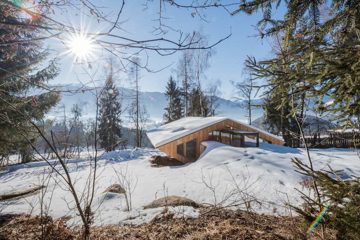 Балкон шале был заменен легкой конструкцией из небольших балок из лиственницы. Диагональные стальные балки, закрепленные на бетонных столбах, поддерживают эту конструкцию. Это новое решение предлагает вдвое больше места, чем раньше. Когда металлическая лестница из стали Corten исчезает в левой боковой стенке, как лестница НЛО, кажется, что весь дом парит над землёй, наклоняющейся на юг.