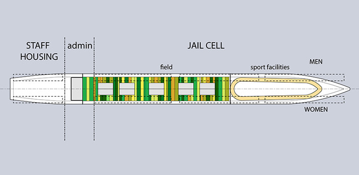 Всего на борту будут находиться 3,3 тыс. заключенных. Каждый из них получит камеру-ячейку площадью 9 квадратных метров. Все камеры вместе образуют гигантские «паруса». Кроме них на корабле разместят мастерскую, административный центр и столовую. В носовой части судна расположат спортивное поле, а в центральной части — площадки для выращивания сельскохозяйственных культур. В грузовой трюм хотят поместить аппаратуру для опреснения воды. Персонал корабля будет жить ближе к корме.