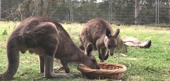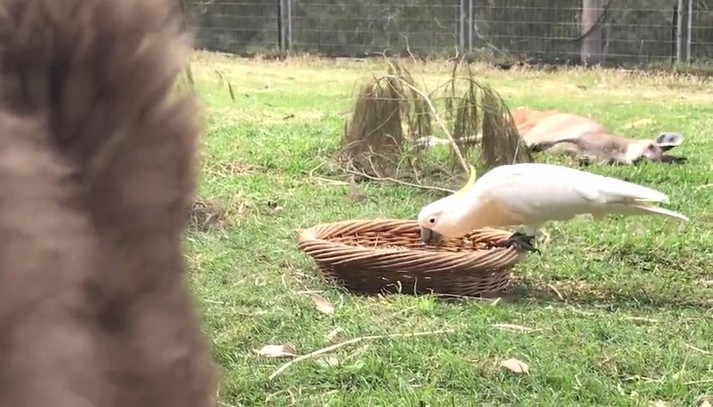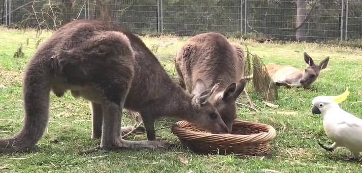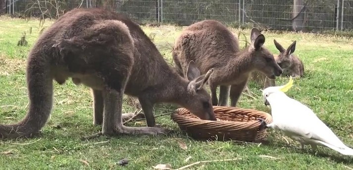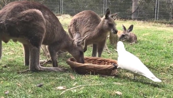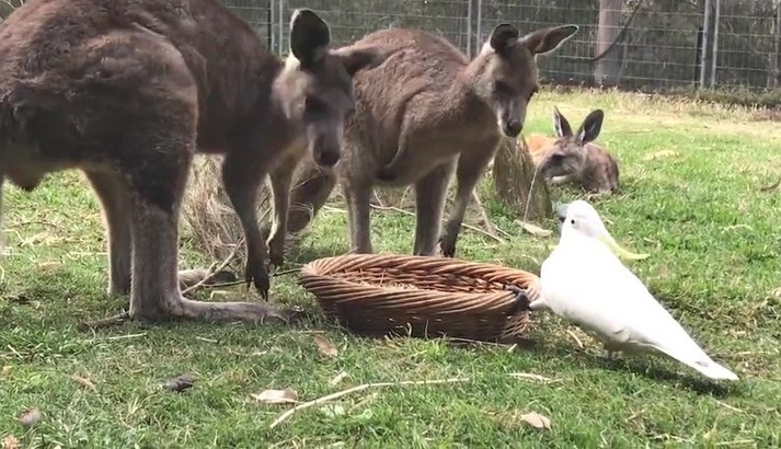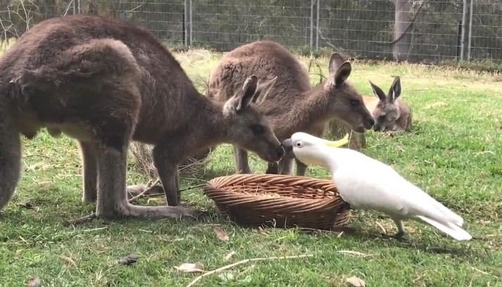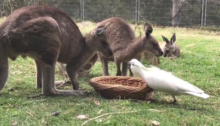 Два кенгуру, которых зовут Джоуи и Фрэнки, спокойно кушали из кормушки в заповеднике дикой природы в Батманс Бэй, Новый Южный Уэльс. Неожиданно к кормушке подошел какаду, котого заинтересовало угощение внутри. Дерзкий попугай клюнул одного кенгуру в нос, затем сделал несколько выпадов в сторону другого.