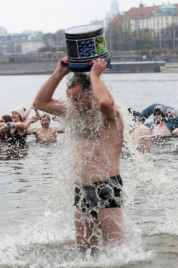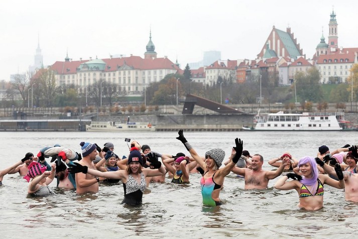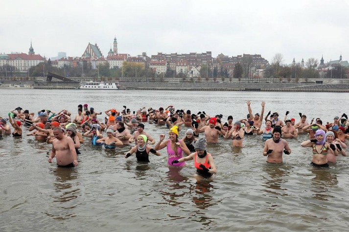 Группа смельчаков окунулась в холодные воды реки Висла в Варшаве.