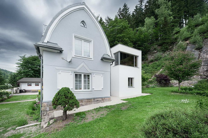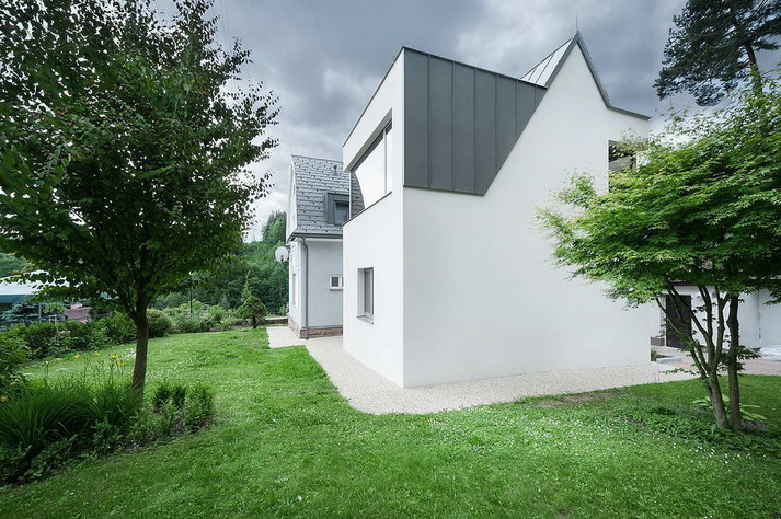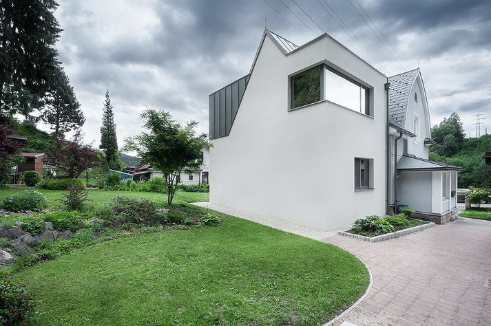 Фасады оригинального дома полностью сохранены в существующем серо-белом дизайне. Фасад пристройки и надстройки выполнен в белом цвете. Крыша обеих частей объединяется серым алюминиевым листовым покрытием.