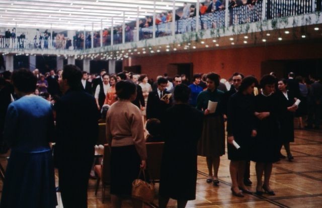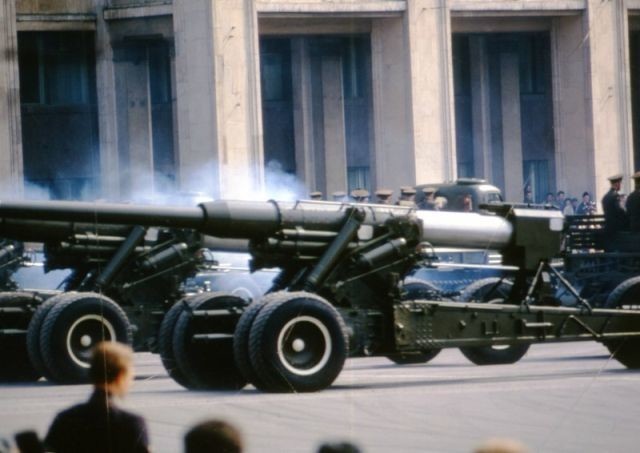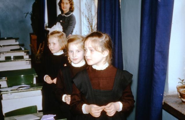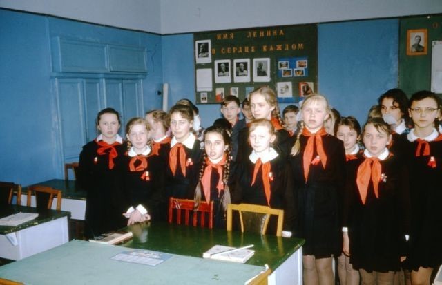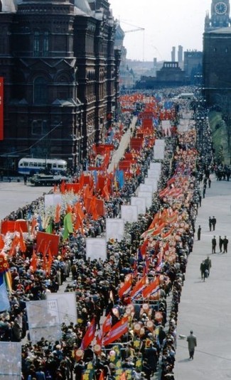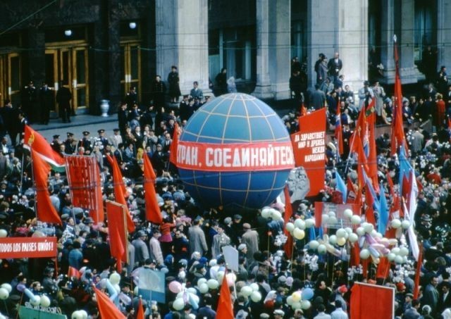 Стоит отметить, что на этих фотографиях особенно бросается в глаза большое количество различных пропагандистских материалов тех времен: красные флаги, цитаты различных коммунистических деятелей и их портреты.