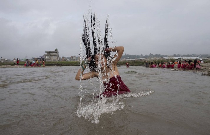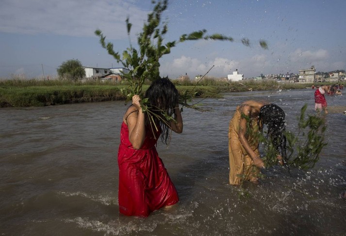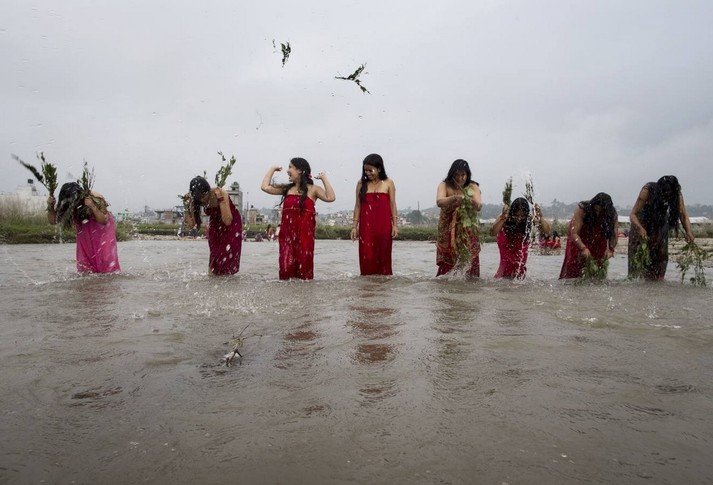 Непальские женщины провели традиционное священное купание в реке Манхара во время фестиваля Риши Панчами в Катманду (столице Непала).
