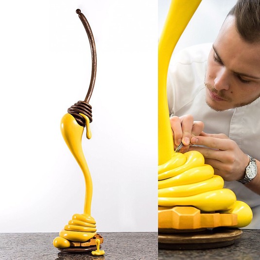 Французского кондитера Амори Гишона за мастерское умение превращать груду шоколада в чрезвычайно реалистичные скульптуры прозвали шоколадным архитектором. Из шоколадной массы он способен создать что угодно: от покрытого цветом дерева до габаритных часов с маятником.