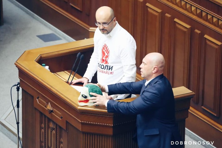 В ходе заседания Кива снял маску и положил ее на трибуну, где в этот момент выступал депутат Сергей Рудык.