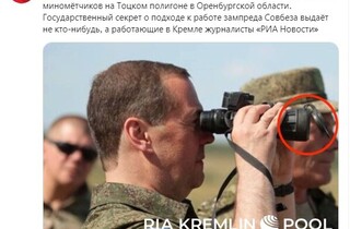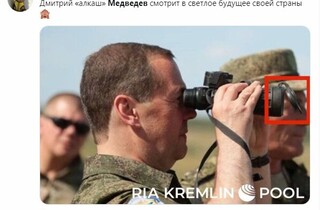 Заместитель председателя Совета безопасности РФ, бывший президент России Дмитрий Медведев рассмешил пользователи соцсетей своим поведением во время военных учений. В частности, в сети обратили внимание, что российский чиновник наблюдает за военными маневрами из-за закрытого бинокля.