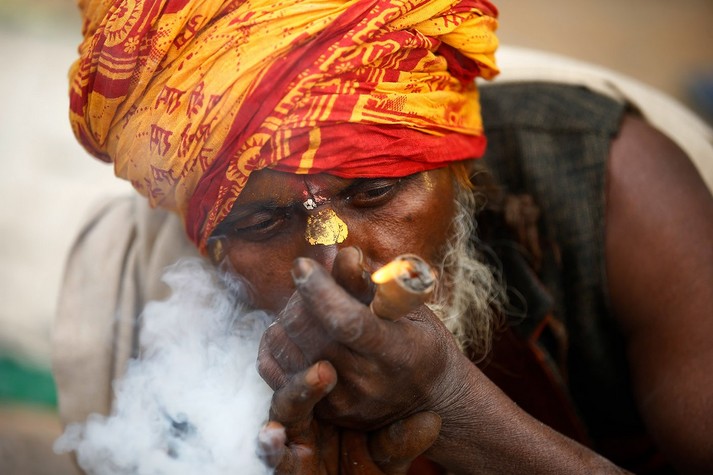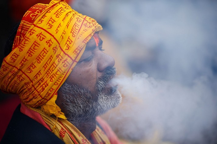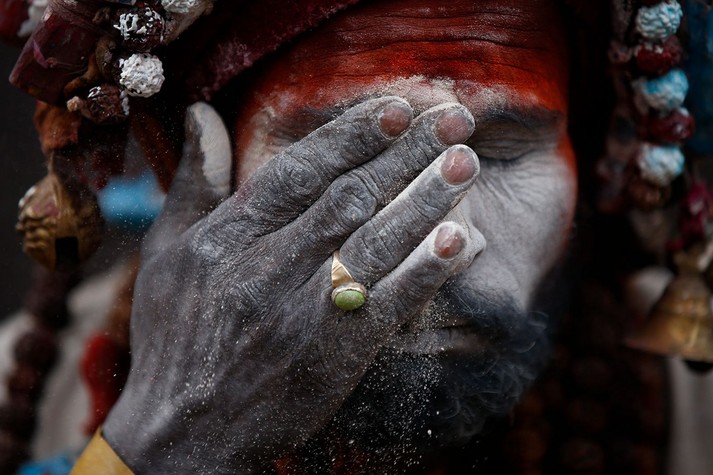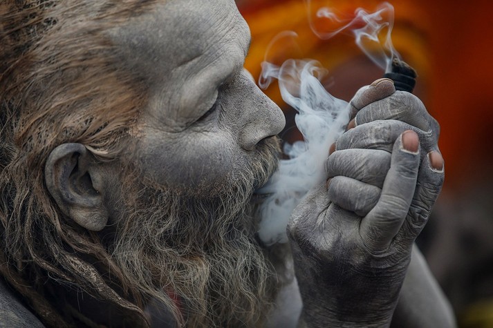 На его снимках мы видим красочные и торжественные портреты святых людей Индии и Непала, которые курят марихуану и молятся индуистскому богу Шиве. Их лица покрыты яркой краской и пеплом.