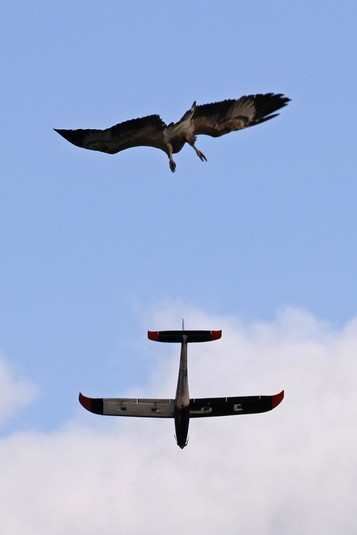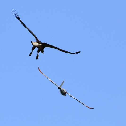Белобрюхий Орлан заметил пару игрушечных планеров в своем воздушном пространстве. Хищная птица решила наказать нарушителей и отправилась в погоню. Преследование длилось около 4 минут, затем орел потерял интерес к планерам и продолжил парить вдоль береговой линии.