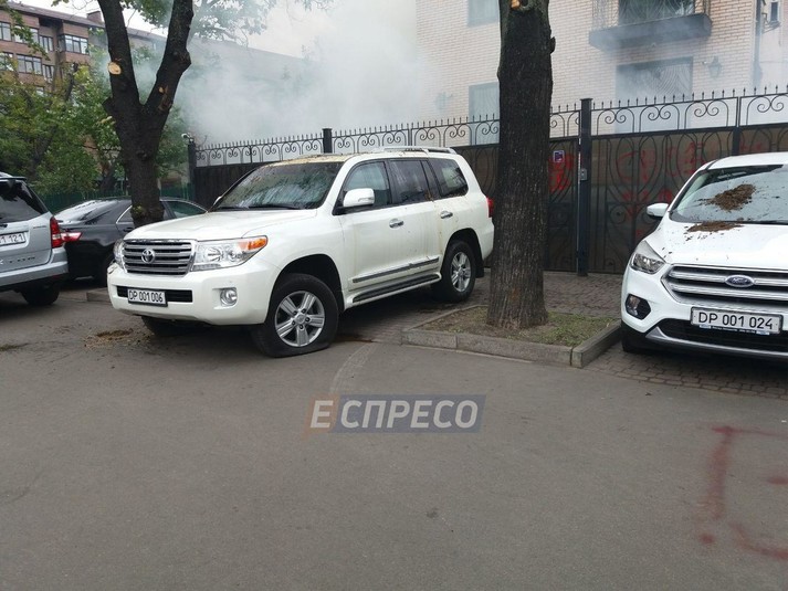 Инцидент произошел в переулке Всеволода Петрива, 8 (быв. Щербакова). Мужчины с ведрами подошли к белым внедорожников с дипломатическими номерами и вылили на машины фекалии, а также пробили шины и бросили файеры во двор дома, где происходил ужин по случаю отставки Воробьева.