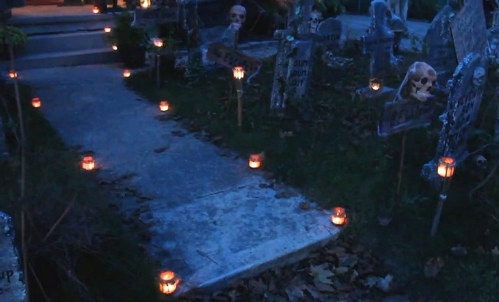 Эти дворы напоминают кладбища с надгробьями, черепами, паутиной, движущимися манекенами и звуковыми эффектами
