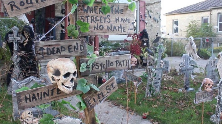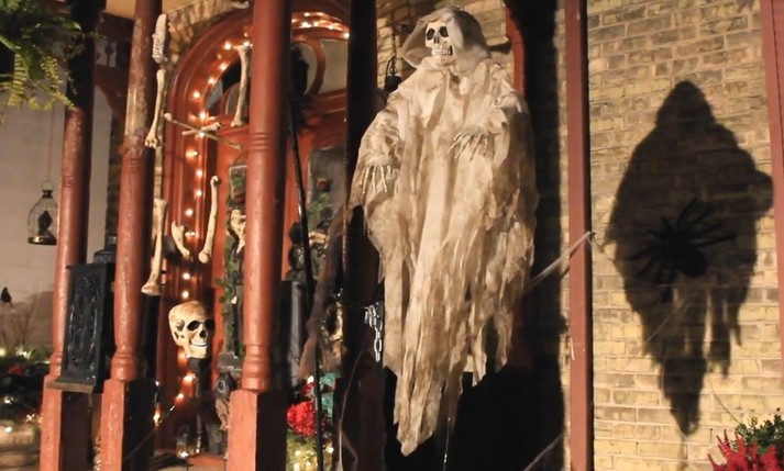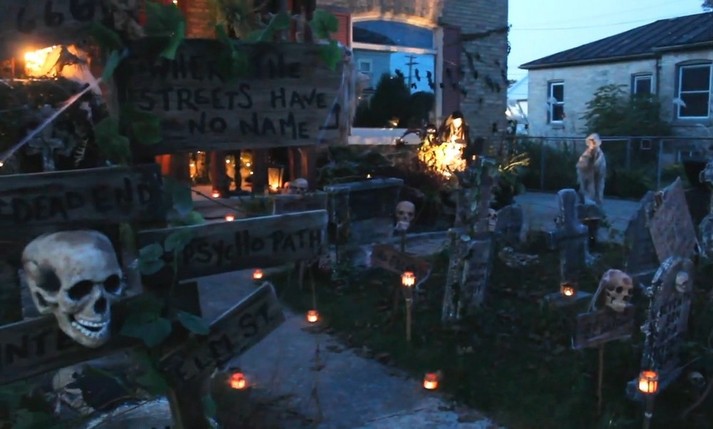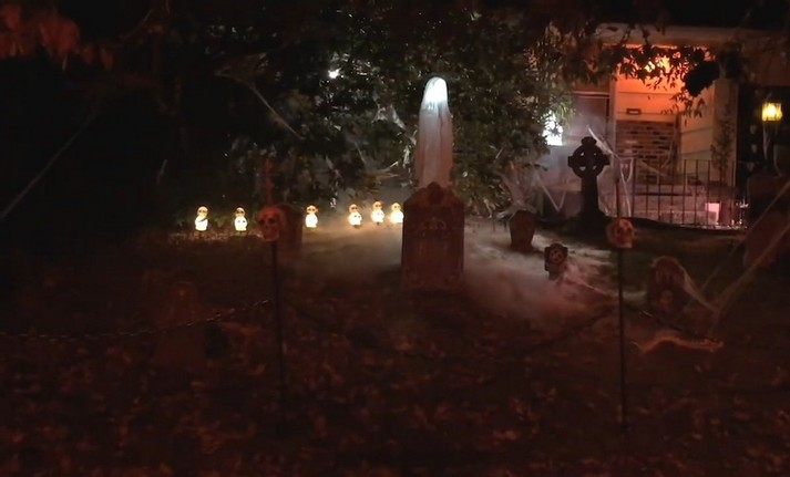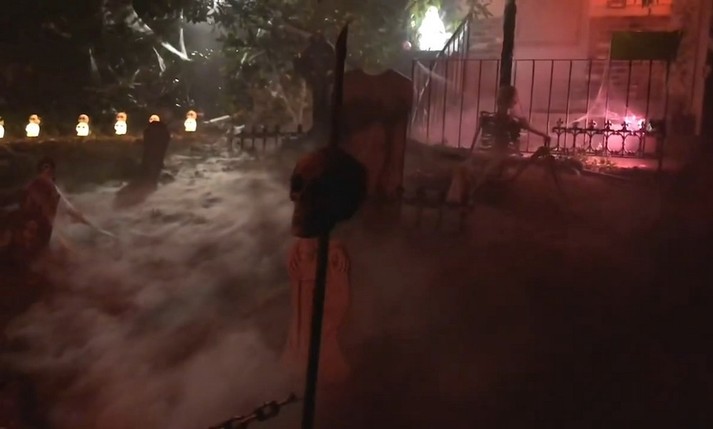 Жуткие дворы напоминают кладбища с надгробьями, черепами, паутиной, движущимися манекенами и звуковыми эффектами.