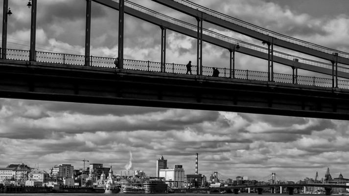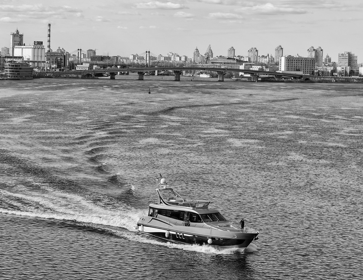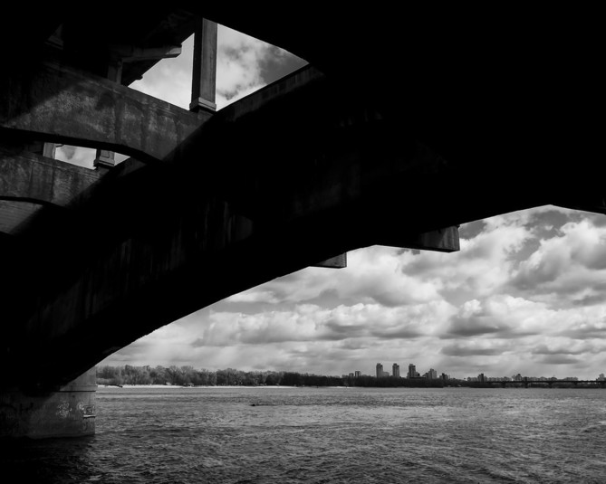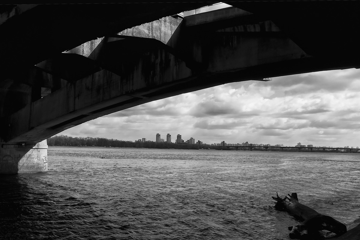 В центре внимания - Днепр и мосты, снятые с нестандартных точек. Новый взгляд на привычный Киев и особая атмосфера черно-белого фото.