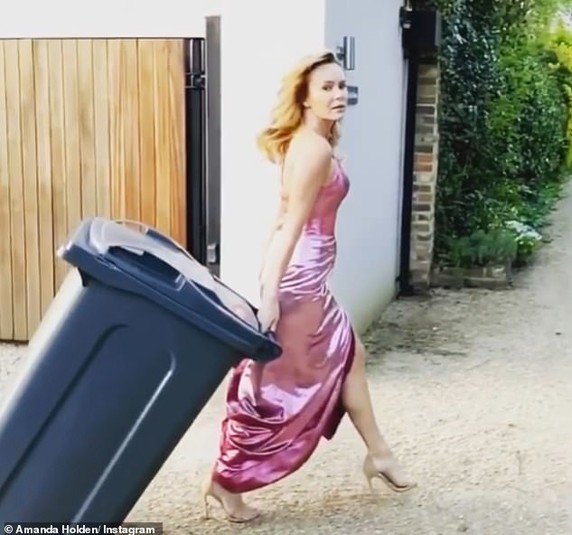 Британская телеведущая Аманда Холден выносит мусор в вечернем платье