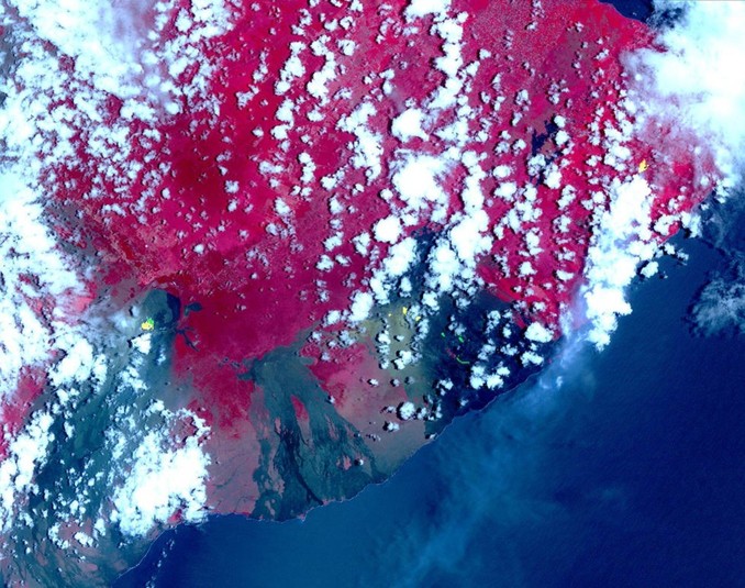 В NASA сообщили, что извержение вулкана вызвало ряд газовых и лавовых трещин в зоне Восточного Рифа вулкана. Истоки диоксида серы из трещин вулкана можно увидеть на втором изображении — они проявляются в желтом цвете.
