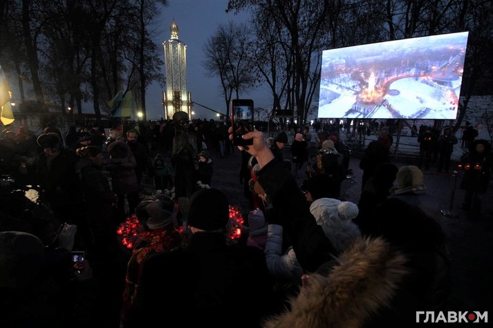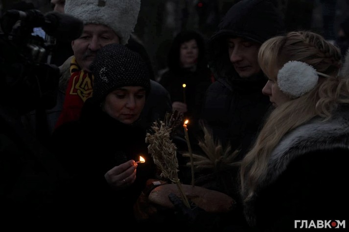 Киевляне и гости столицы приняли участие в церемонии. Они приносили к мемориалу букеты колосков и свечи.