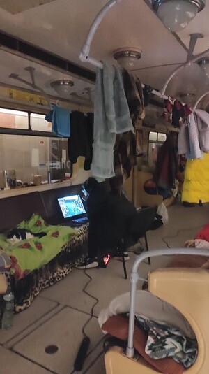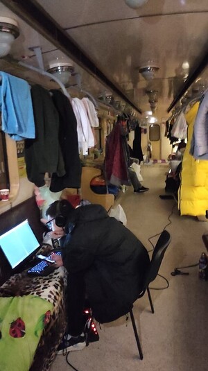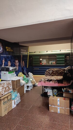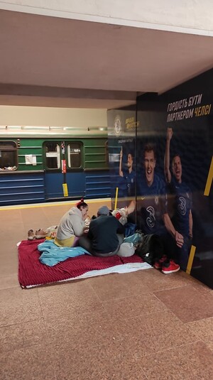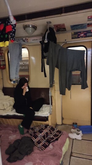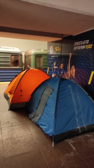 На фото из метро видно, что люди уже настроились на долгое проживание. В вагонах висят вещи, на платформе разложены палатки. Кое-кто пытается работать.
