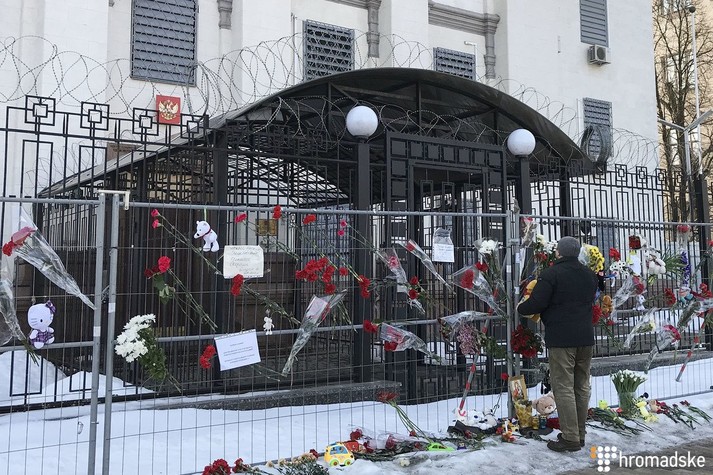 Под посольство РФ в Киеве несут цветы и игрушки (фото, видео)