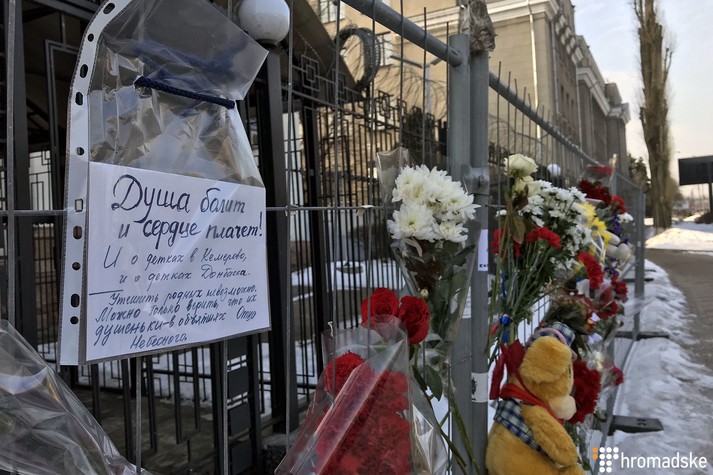 В Киеве под здание российского посольства неравнодушные граждане несут букеты цветов и детские игрушки в знак скорби по погибшим при пожаре в Кемерово.