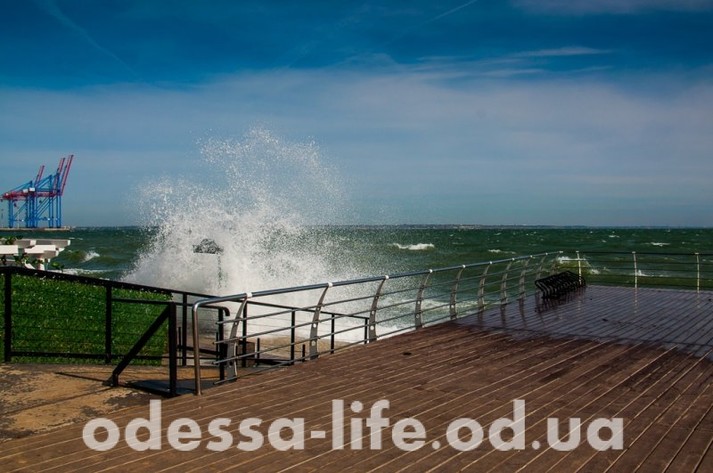 На набережную около дельфинария на пляже Ланжерон обрушивались высокие волны.