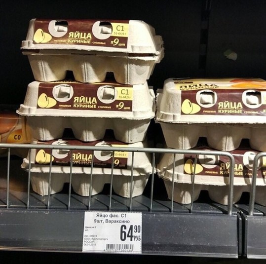 Теперь на прилавках магазинов можно даже увидеть упаковки с яйцами, где внутри находятся не 10, а уже 9 яиц. Стоимость такой «девятки» яиц составляет почти 65 рублей. Сотрудники «Русской службы Би-би-си» попытались разобраться в этой ситуации и обнаружили несколько аналогичных попыток скрыть рост цен на продукты в России.