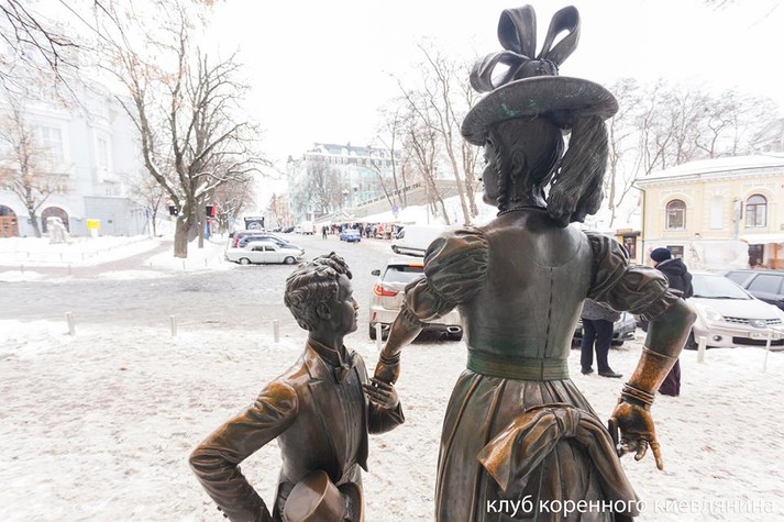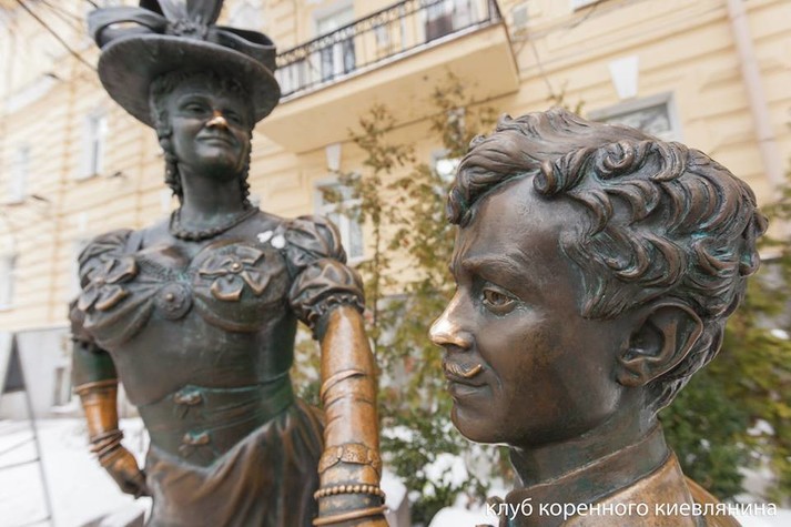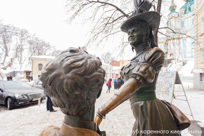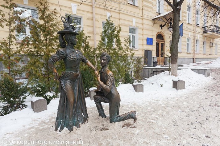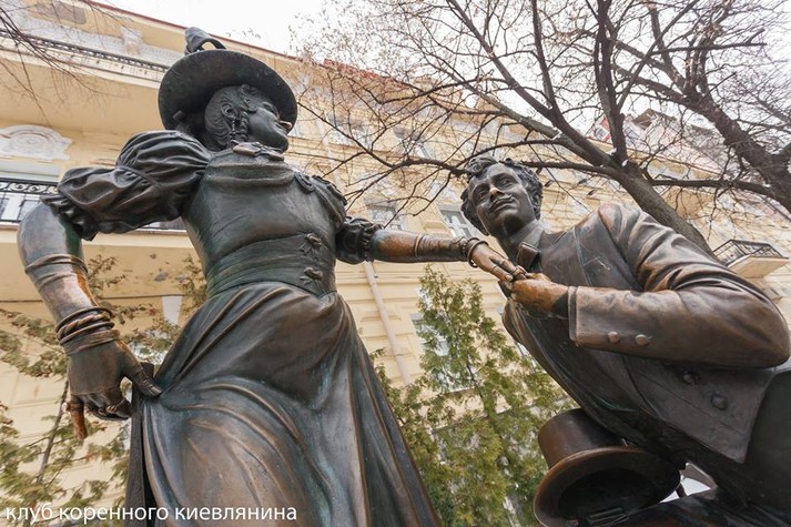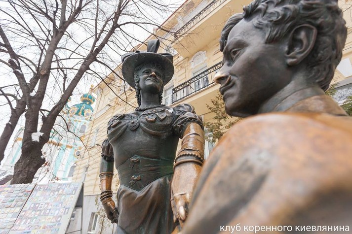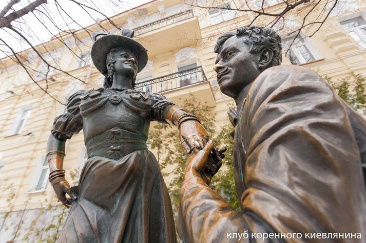 На перекрестке трех дорог - Андреевского спуска, ул. Владимирской и Ул. Десятинной - стоит замечательный памятник, увековечивший героев самой любимой украинской комедии «За двумя зайцами» Свирида Петровича Голохвастова и Проню Прокоповну Серкову (Сирко), которых сыграли замечательные артисты Олег Борисов и Маргарита Криницына.