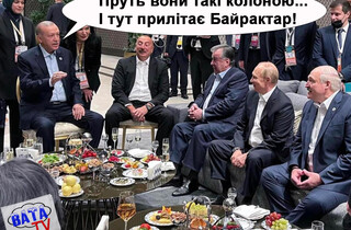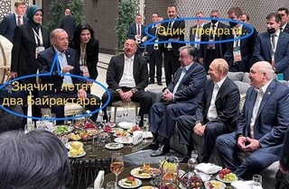 На опубликованном снимке, который зафиксировал эту встречу за столами с напитками и едой, нетрудно заметить, что в центре внимания находится президент Турции Реджеп Тайип Эрдоган. Достаточно раскованно ведет себя рядом с турецким лидером президент Азербайджана Ильхам Алиев. Между тем, Путин и его коллега из государства-сателлита Александр Лукашенко с восторженными выражениями на лицах слушают рассказ турецкого президента.