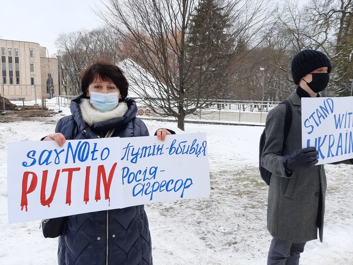 Участники держали плакаты с надписями: «Остановите Путина», «Россия убирайся домой», «Скажите НЕТ российской войне в Украине» и другие.