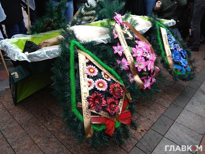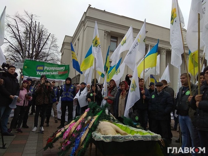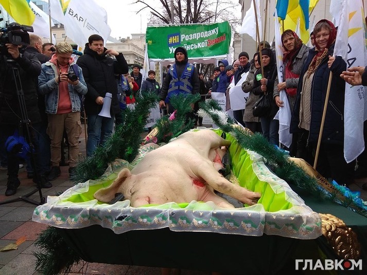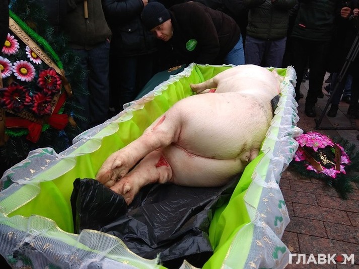 Крестьяне принесли под Верховную Раду тушу свиньи в гробу, символизирующую смерть сельского хозяйства в случае принятия законопроекта №2178 о запуске рынка земли.