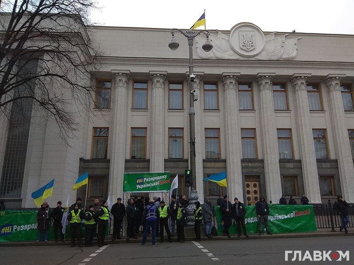 Под Верховной Радой проходит митинг против продажи земли. Как передает корреспондент «Главкома», перед парламентом собралось более 200 человек.