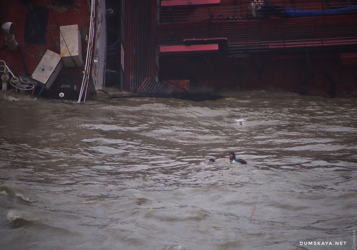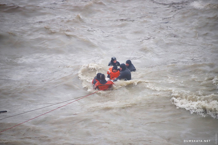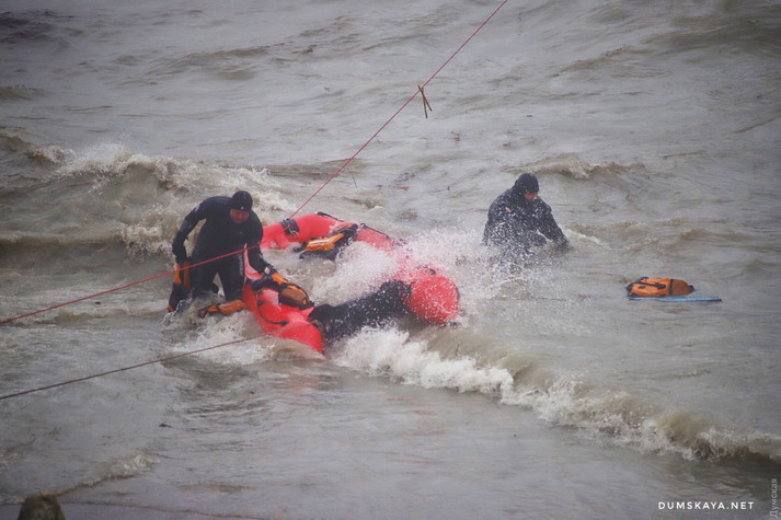 Сначала для эвакуации пытались использовать надувную лодку и водный скутер, но помешали волны