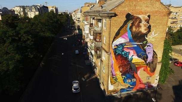 На Подоле художник из Италии нарисовал медведя, у которого вместо лап - человеческие руки