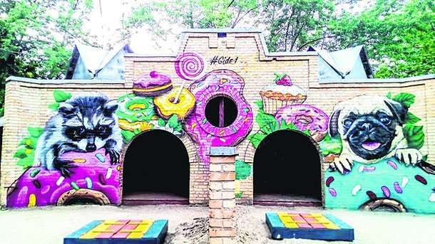 Еще один новый «звериный мурал» можно увидеть на территории детсада по улице Маршала Тимошенко, 18-а. Там художники разрисовали стену, украсив ее яркими изображениями енота и мопса, которые любят сладости.